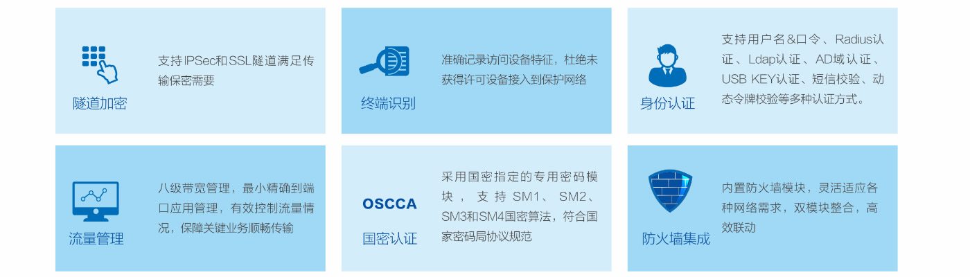 思為同飛VPN產(chǎn)品是以IPSec VPN、SSL VPN、L2TP VPN、PPTP VPN、GRE等多種業(yè)內(nèi)主流VPN模塊為基礎(chǔ),融合訪問控制、入侵檢測、帶寬管理、路由通信、報(bào)文過濾等安全模塊為一體的安全網(wǎng)關(guān)設(shè)備。思為同飛VPN系列產(chǎn)品具備多項(xiàng)核心技術(shù),為用戶提升移動(dòng)接入的安全性,簡化安全策略的部署,優(yōu)化傳輸速度,讓用戶獲得最佳的移動(dòng)訪問體驗(yàn),幫助用戶節(jié)省大量的IT建設(shè)成本。中華人民共和國國務(wù)院令第273號《商用密碼管理?xiàng)l例》中在第十四條明確指出:任何單位或者個(gè)人只能使用經(jīng)國家密碼管理機(jī)構(gòu)認(rèn)可的商用密碼產(chǎn)品。