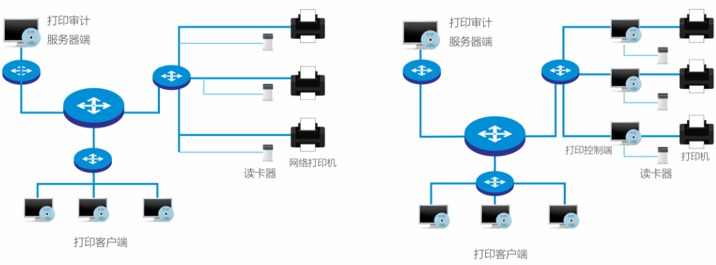 包括打印審計(jì)服務(wù)器端、打印客戶端、網(wǎng)絡(luò)讀卡器、網(wǎng)絡(luò)打印機(jī),部署模式如下: