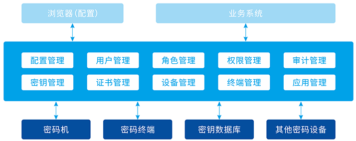 ● 以安全硬件密碼設(shè)備為支撐,從密鑰使用的角度對業(yè)務(wù)系統(tǒng)中的各種密鑰進行管理;